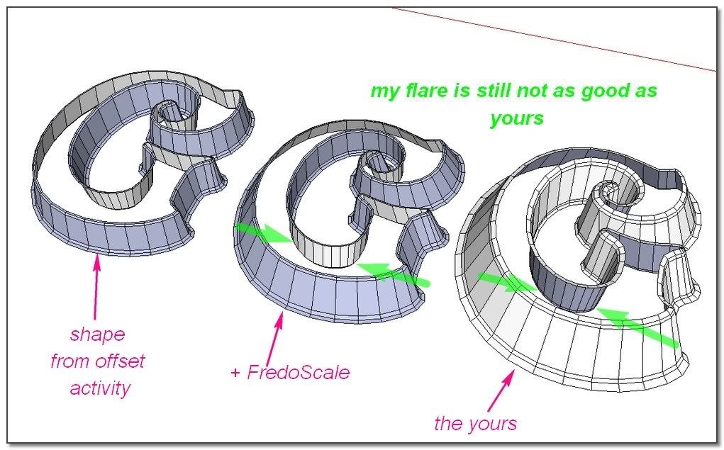 • A very important thing I have learned here is that: an offset doesn't give the same outer edge than a scale??(really a surprise to me) this is the reason why I was not able to do the right flare using scale tool and FredoScale!!