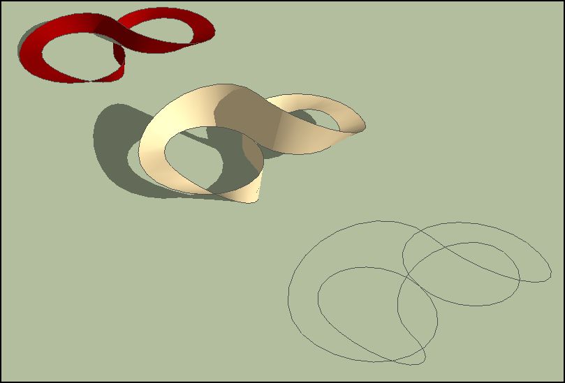 - It is not possible to make a 'flat' Möbius strip, because if it is completely 'flat' some of its geometry will intersect with itself and cut it, making it into something that is NO LONGER a Möbius strip. BUT... you can take a copy of the Möbius strip made in step 1) and Scale it vertically using its top-center handle, keep Scaling it by 0.1 steps until it is 'almost' flat [or try a one off, typing in 1mm to make it only 1mm high!] - that will still be a Möbius strip - 'and it is almost flat'; use Undo if the Scaling makes it so flat that it starts to intersect with itself and destroys its own Möbius-ness...
