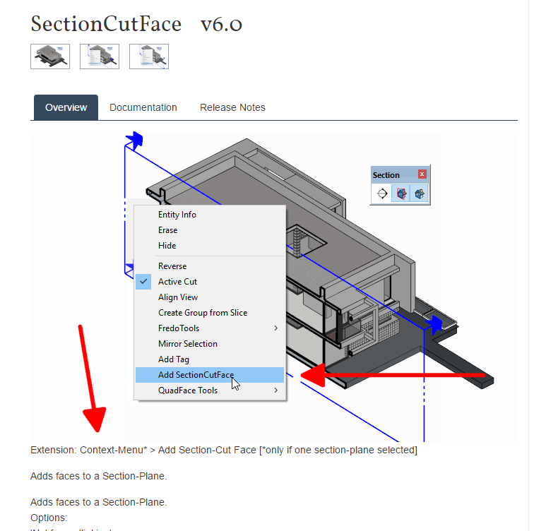 The instructions for use are provided on the information page for the plugin. It will be found in the Context menu when you context click on a section plane.