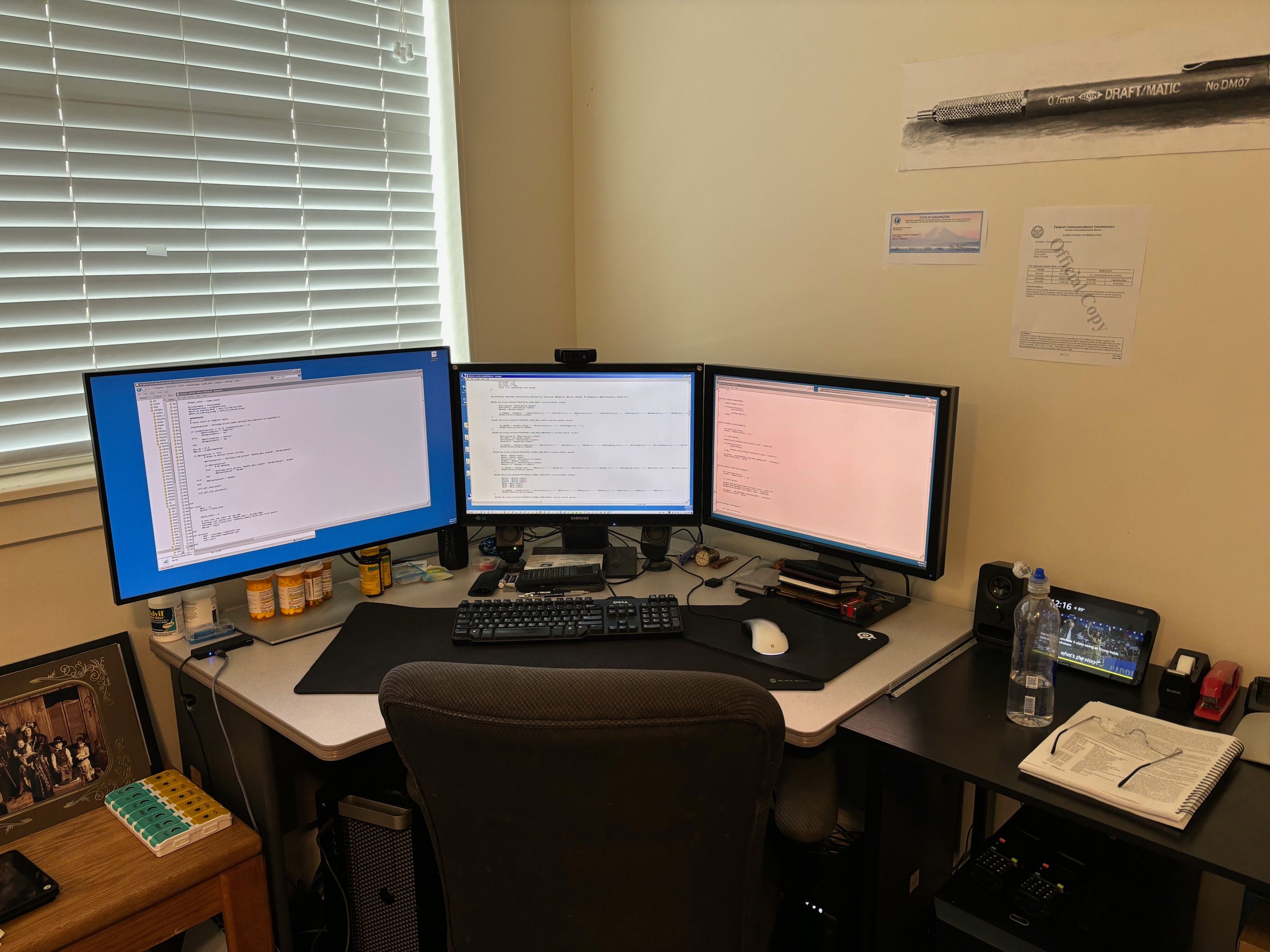 This is my current desk setup, I've just added the big monitor to my left which gives me more screen real estate and improves my coding efficiency. This is where all the magic happens, at least for now.