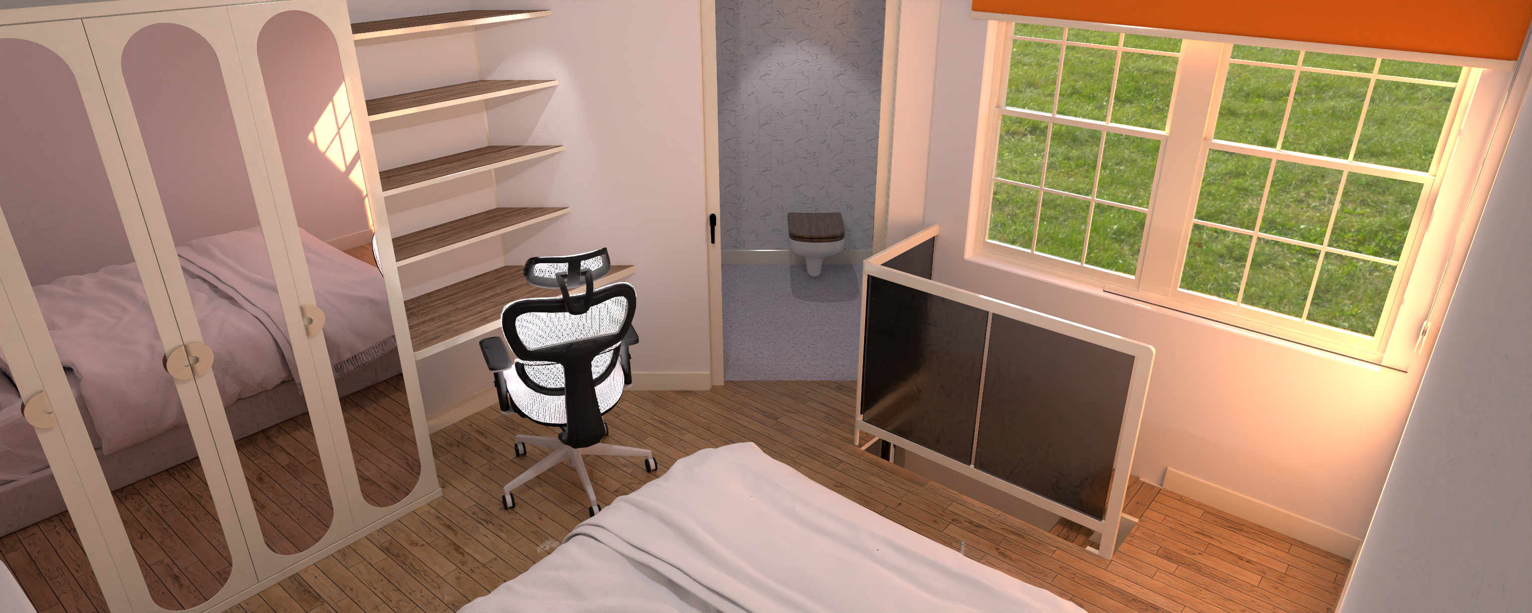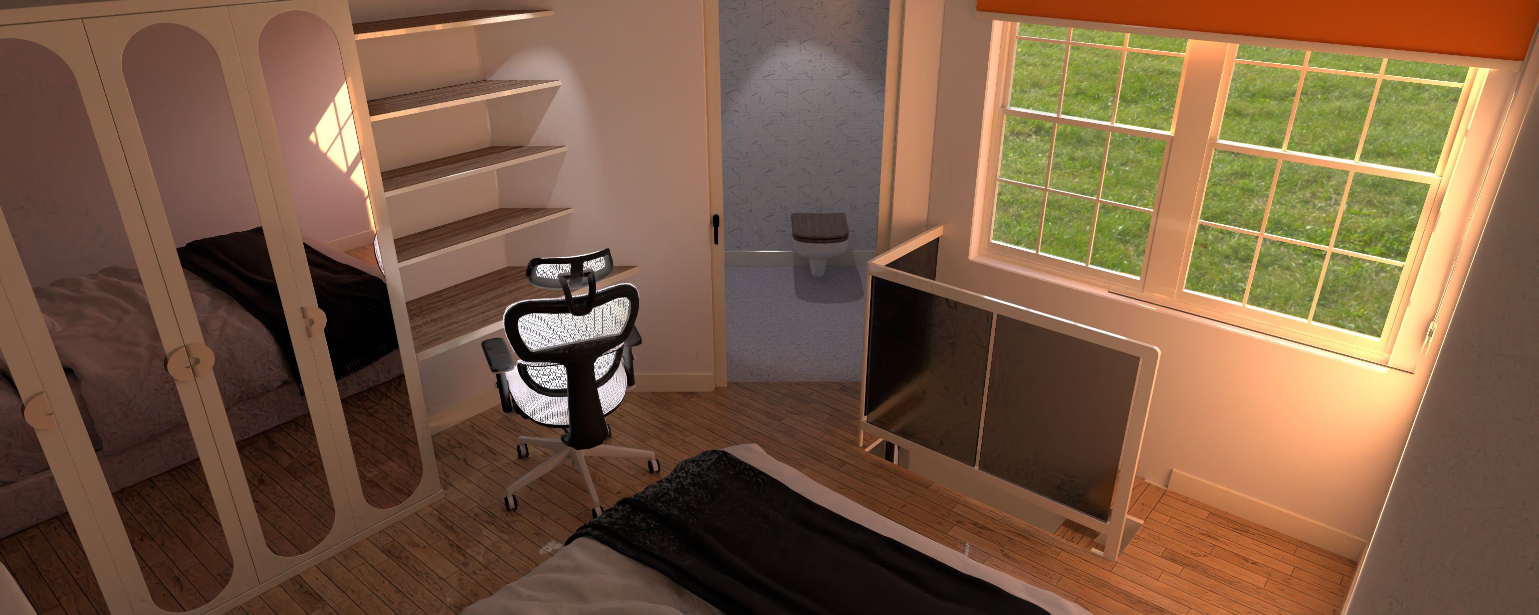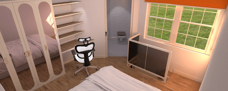 Upper floor, poor scaling of the laptop and a 3.5' bed make it look toylike.