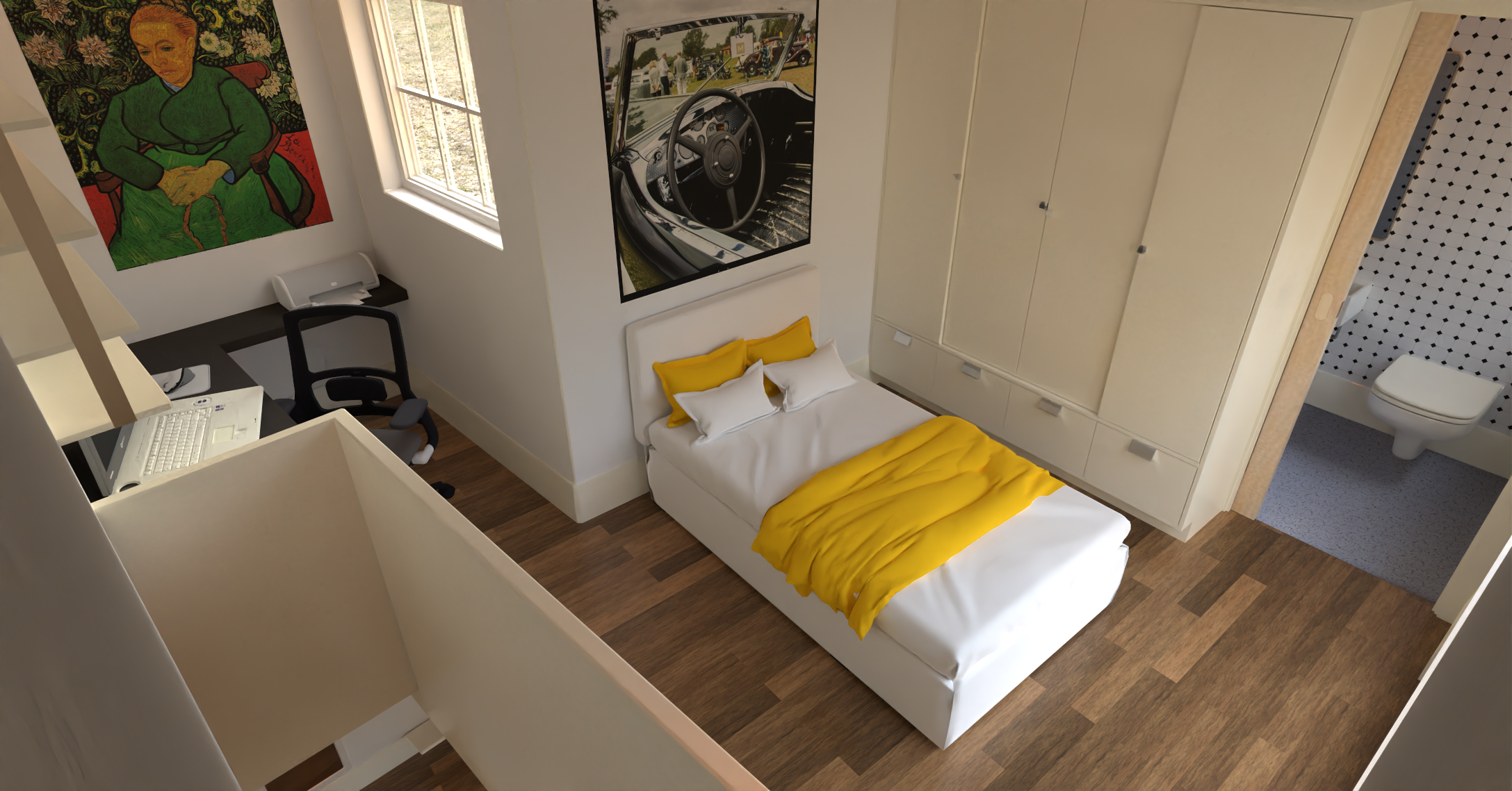 Upper floor, poor scaling of the laptop and a 3.5' bed make it look toylike.