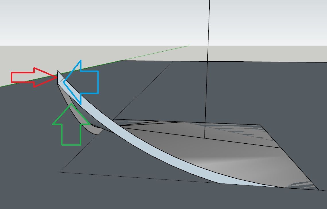Hi Guys, I have a model I am trying to make. It is basically trying to peel up something like peeling up something with thickness like peeling up the corner of a carpet with thickness. The way I attempted having a go. The red arrow is pointed where the corner is as I did it. The blue arrow is how the line should be The green arrow shows the area where if my i would like to have thickness and my plan would give it a bottom probably with "from contours" so my wat is not how the geometry is faked and not like it would be to replicate how the geometry is pulled up like in the real world. Sorry for my clubsy question
