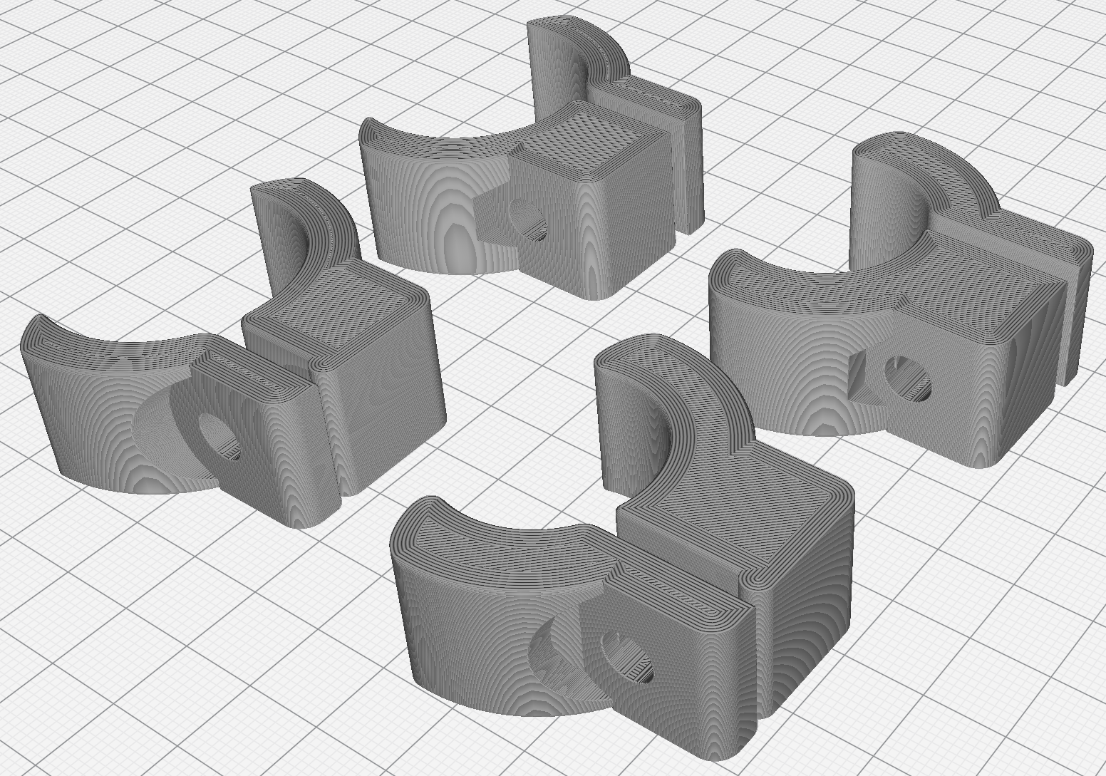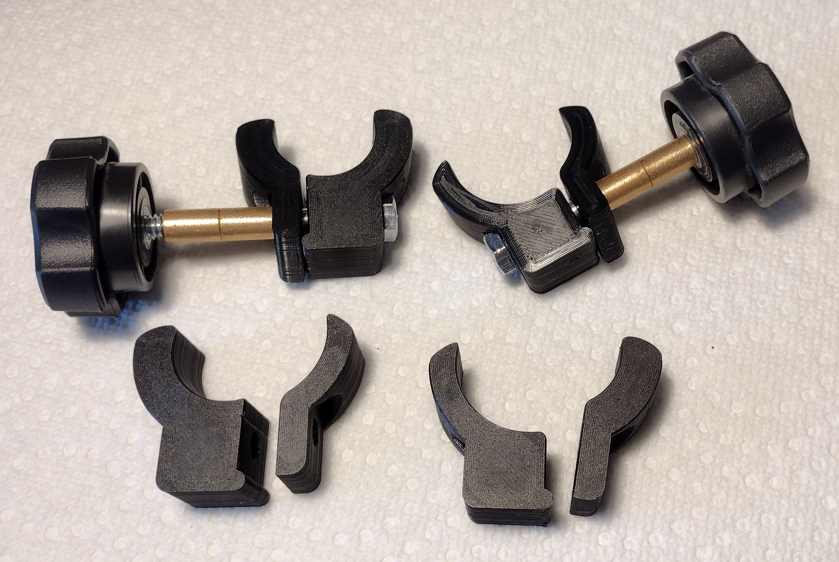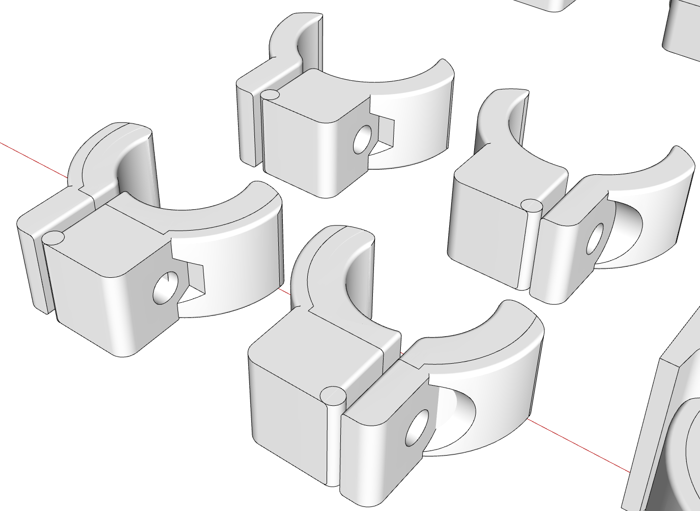 These are some clamps to go onto round tubes. There are two sets for two different sizes of tubing. The larger ones were modeled first. Rather make new ones for the smaller tube I just modeled a sort of filler as a separate solid. The original design didn't have the fulcrum (cylinder) but I added it, again as a separate solid. I decided not to merge them so that the clamps are easier to modify if needed.